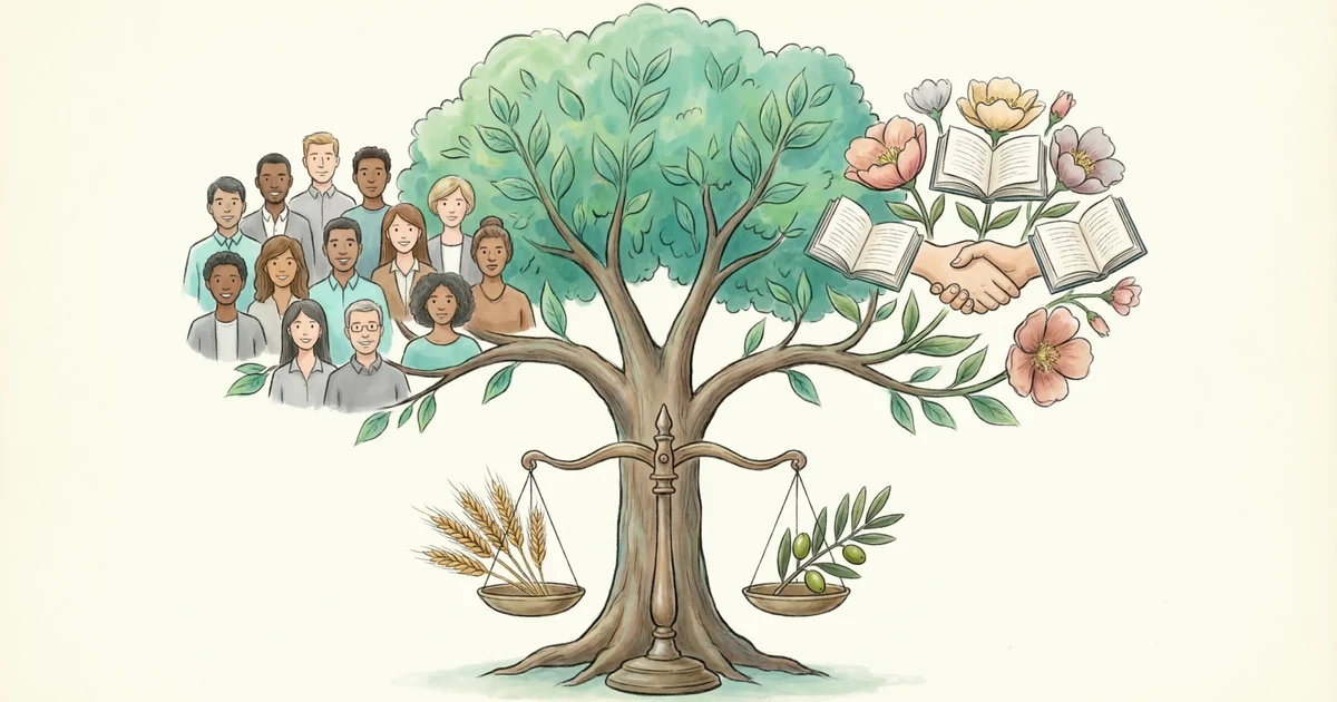 Visual metaphors representing democracy as teamwork, balance, and growth