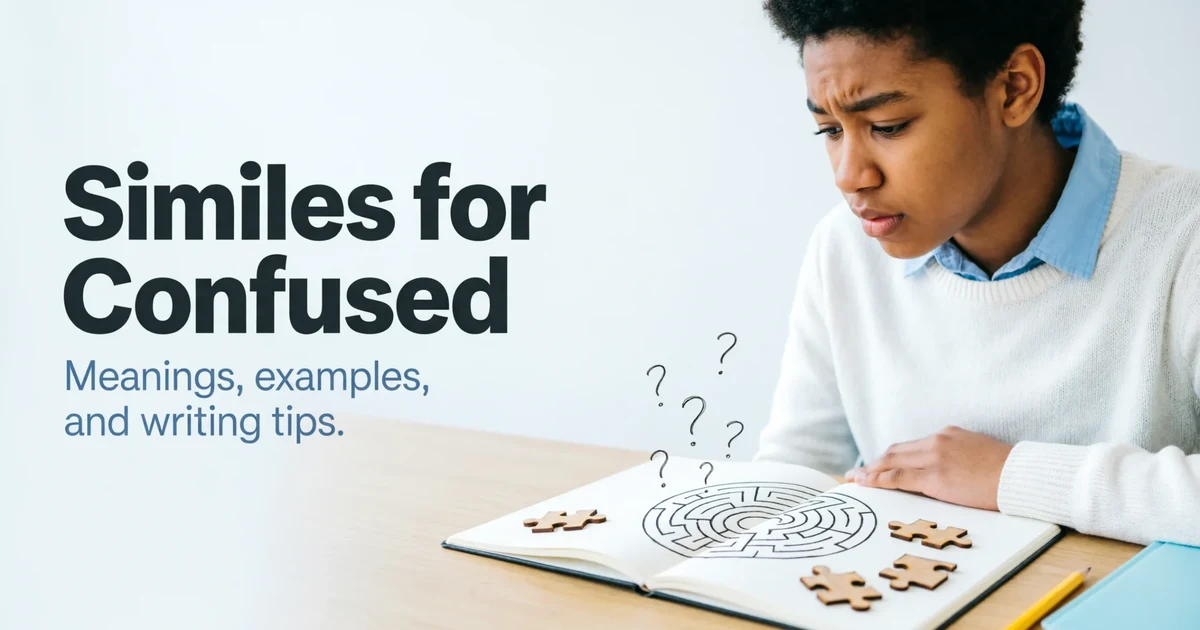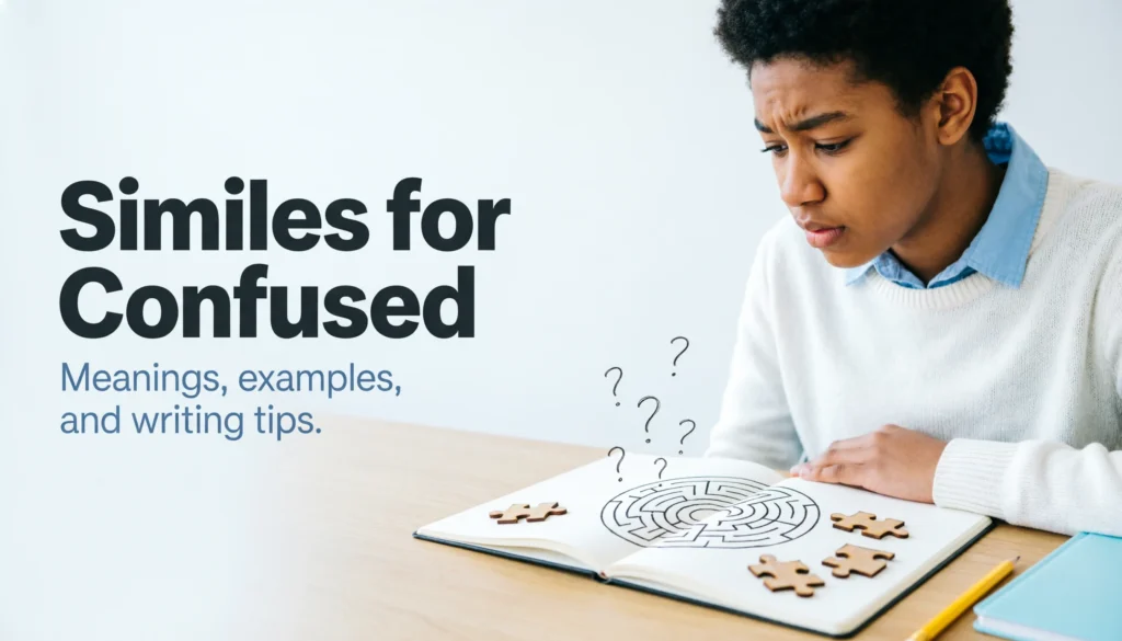 Similes for confused make writing clearer, stronger, and more visual. Instead of only saying someone feels confused, you can show the feeling through a simple picture. A student may feel like a reader starting from the last page. A character may look like a deer in headlights. A tired mind may feel like a computer with too many tabs open. The best simile depends on tone, purpose, and audience. Choose simple comparisons for school and ESL writing, funny ones for casual speech, and deeper images for stories or poems. A good simile turns confusion into something readers can see.